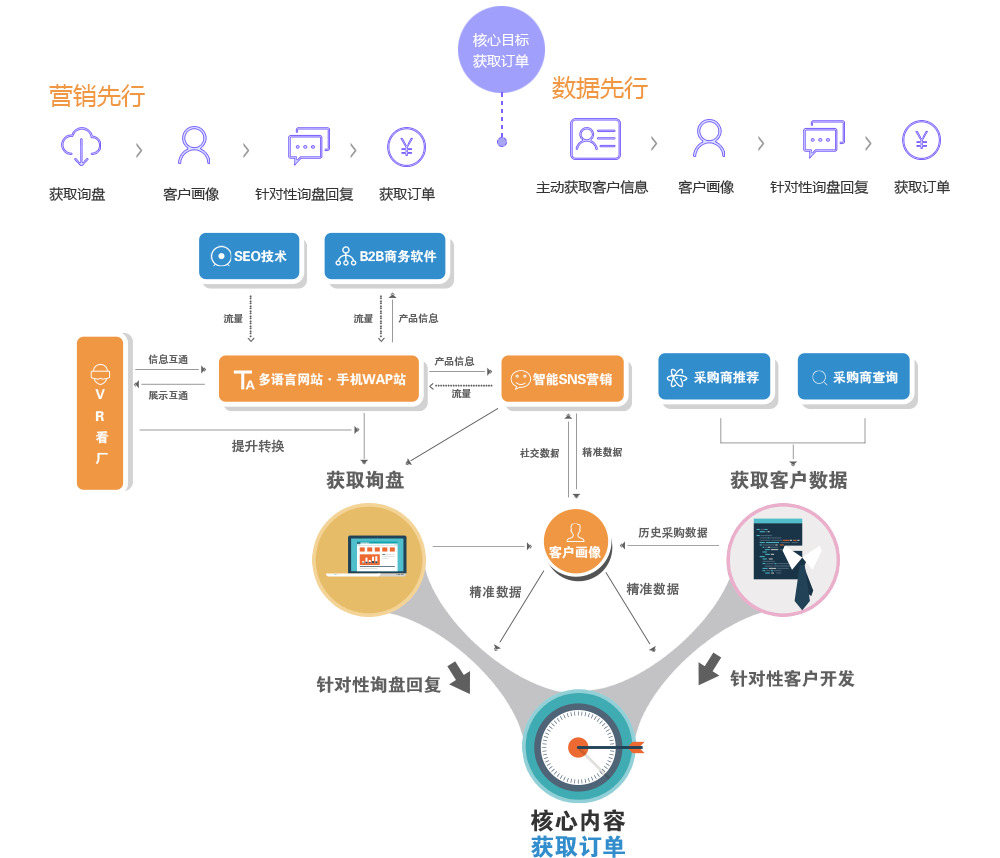 SEO技術(shù)通過(guò)搜索引擎為網(wǎng)站帶來(lái)流量,網(wǎng)站上展示VR全景看廠(chǎng)提升轉化率,產(chǎn)生更多詢(xún)盤(pán)。對詢(xún)盤(pán)進(jìn)行曾經(jīng)采購行為分析,客戶(hù)畫(huà)像,進(jìn)行深度SNS挖掘獲得客戶(hù)詳細情況,并有目的地精準聯(lián)系,獲得訂單。